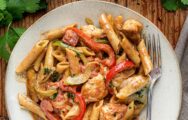 Creamy Chipotle Chicken Alfredo, with Organic Penne Pasta, with a Bell Peppers Fajita and fresh Parsley.