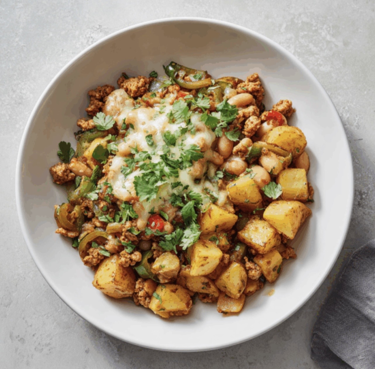ground beef, potatoes, avocado oil, bell pepper, green chiles, white beans, garlic, onion, cumin, Monterrey cheese, cilantro, salt, pepper