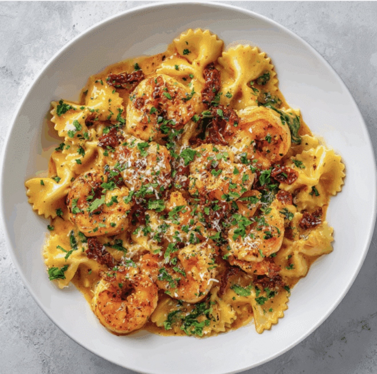 Sauteed shrimp served over creamy, spiced diavolo bow tie pasta, garnished with fresh parsley and parmesan roasted cherry tomatoes with cauliflower.