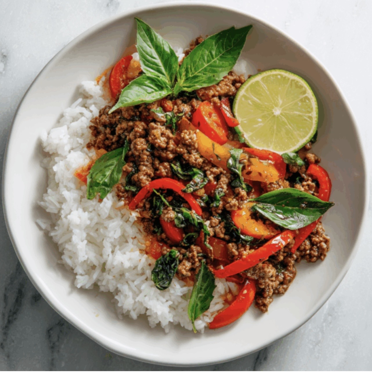 ground beef, white rice, basil, bell pepper, soy sauce, oyster sauce, vinegar, lime juice, Thai chili, onion, garlic, avocado oil